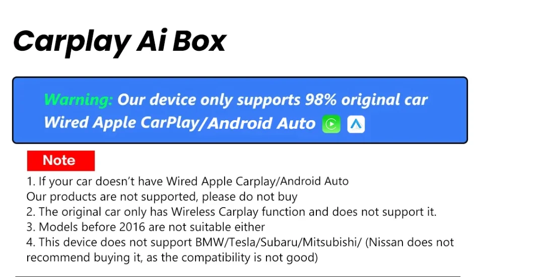 1. This product only supports OEM car radios with 98% wired Apple Carplay/Android Auto